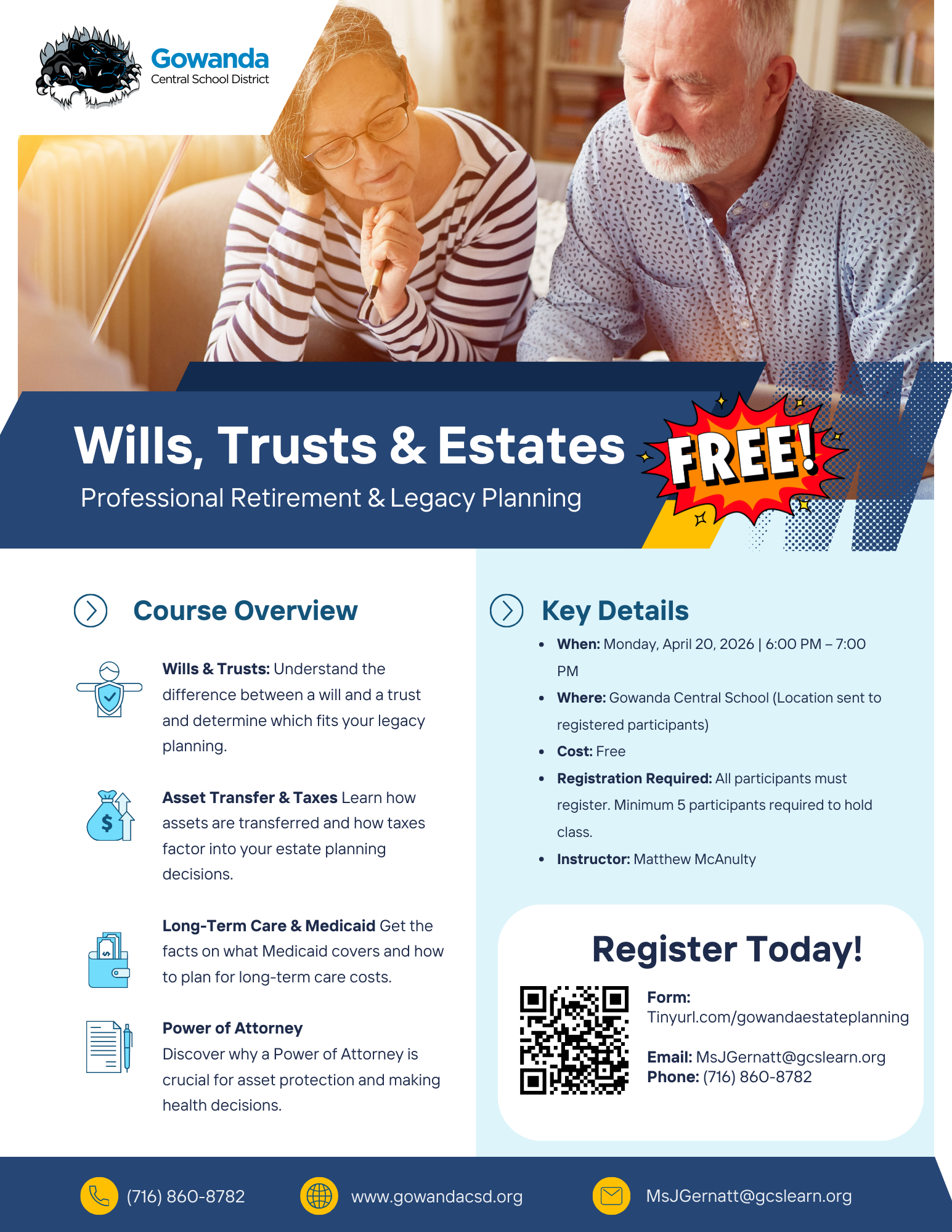 Professional retirement and legacy planning with Matthew McAnulty. Gain clarity on asset transfers, taxes, Medicaid coverage, and Power of Attorney. Registration is free but required.